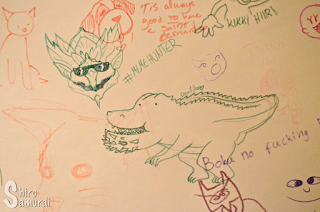 During the night time me, Sacchan and Firith wanted to draw something on the paper that had been taped on the wall next to the stairs leading upstairs. It was one of those that some cons have on which attendants can draw whatever they want. At first I just drew a few smaller things but then stuff escalated and I drew memes, tentacles and even Dugtrio.